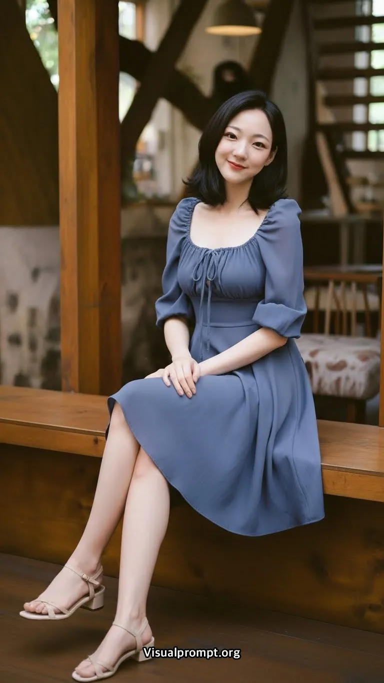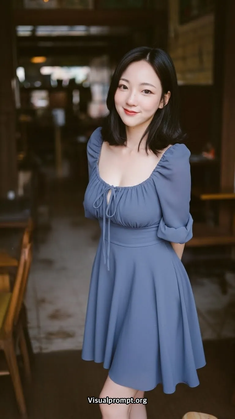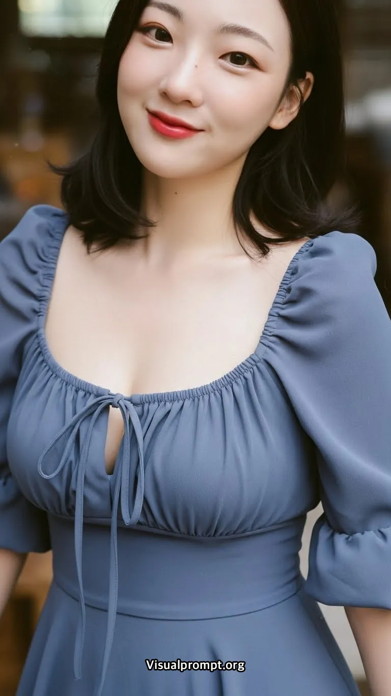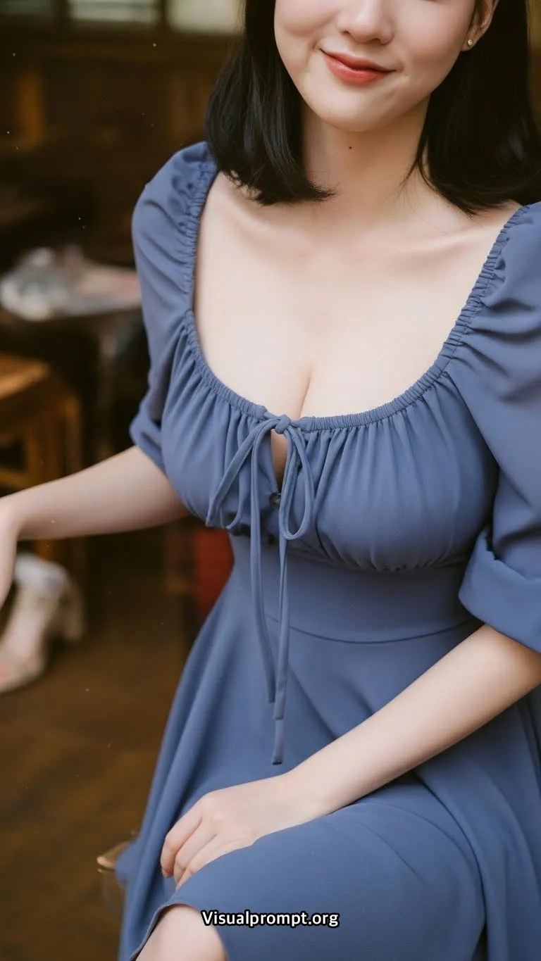 A tall woman with a fair complexion and shoulder-length black hair. She has a skinny frame with (perfectly contoured physique:1.5) significantly large breasts, (cleavage visible:5) and pretty legs, and pretty legs, featuring highly detailed skin texture and facial details. She is wearing a dusty blue, knee-length dress with a deep square neckline, and a tie detail at the bust. Her footwear is light-colored, open-toed shoes with low heels.