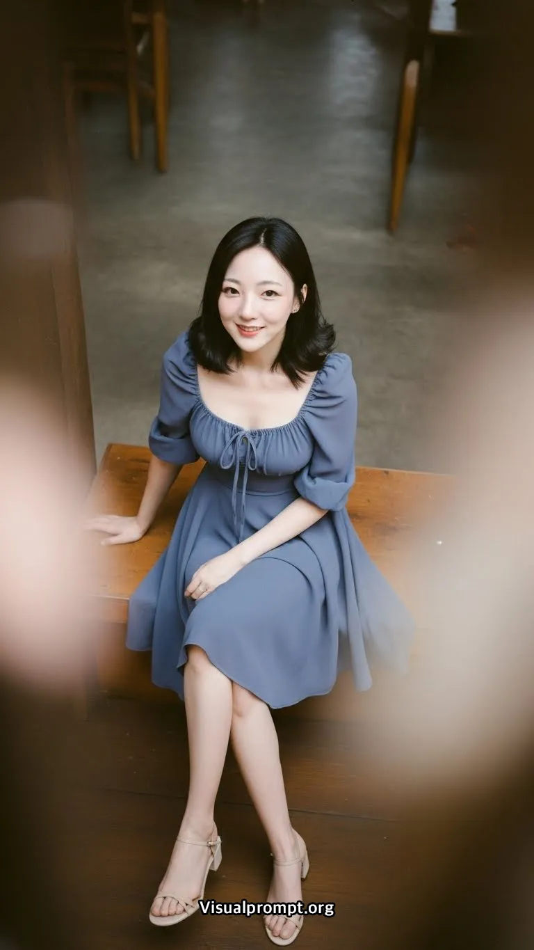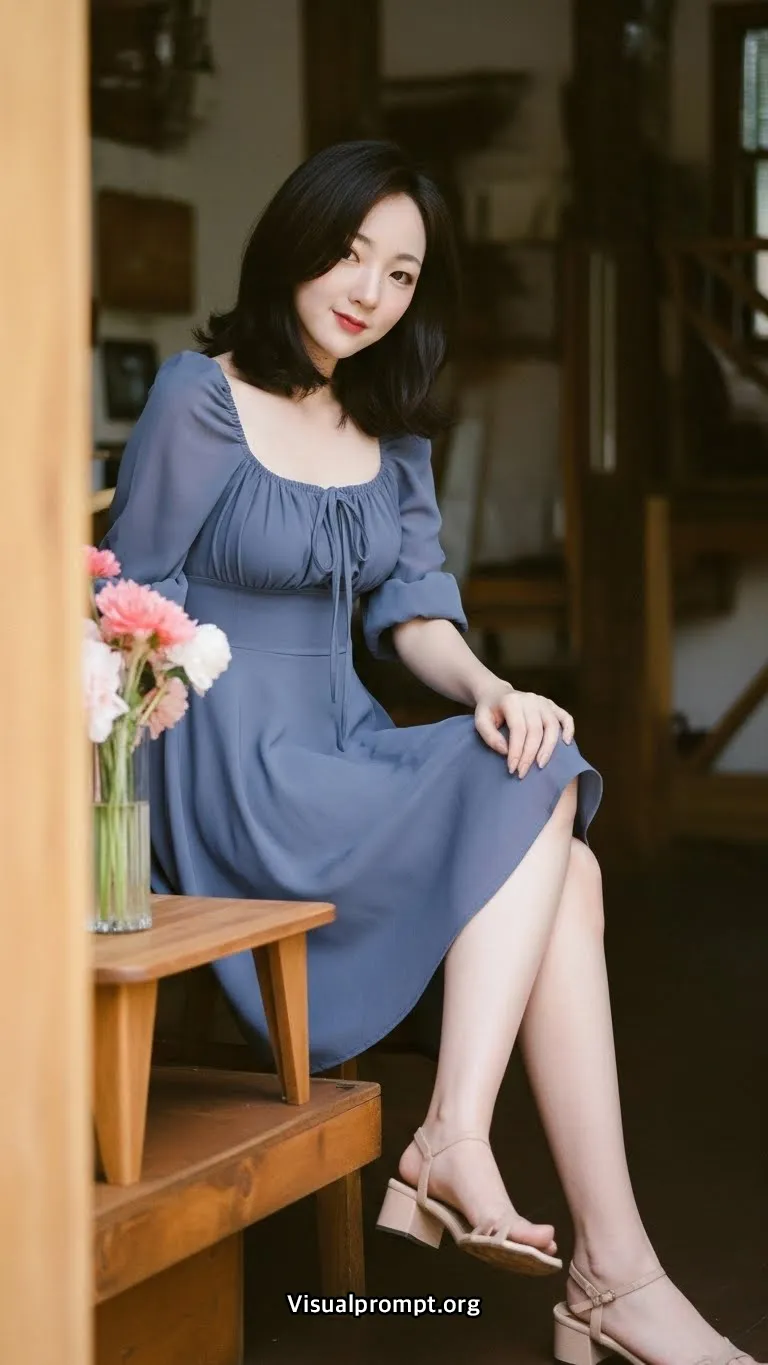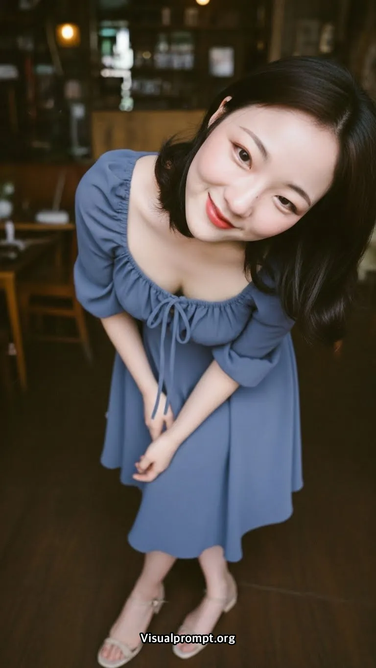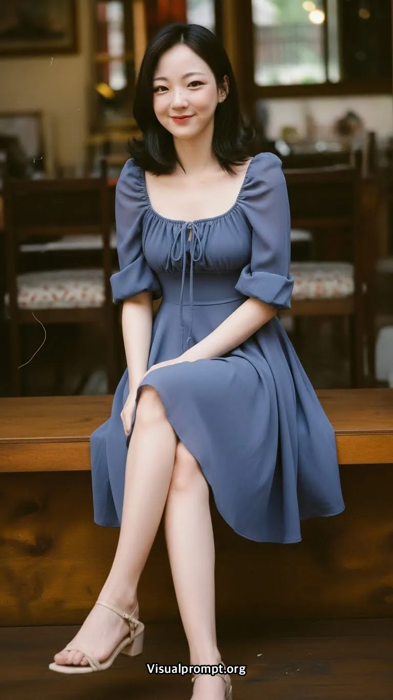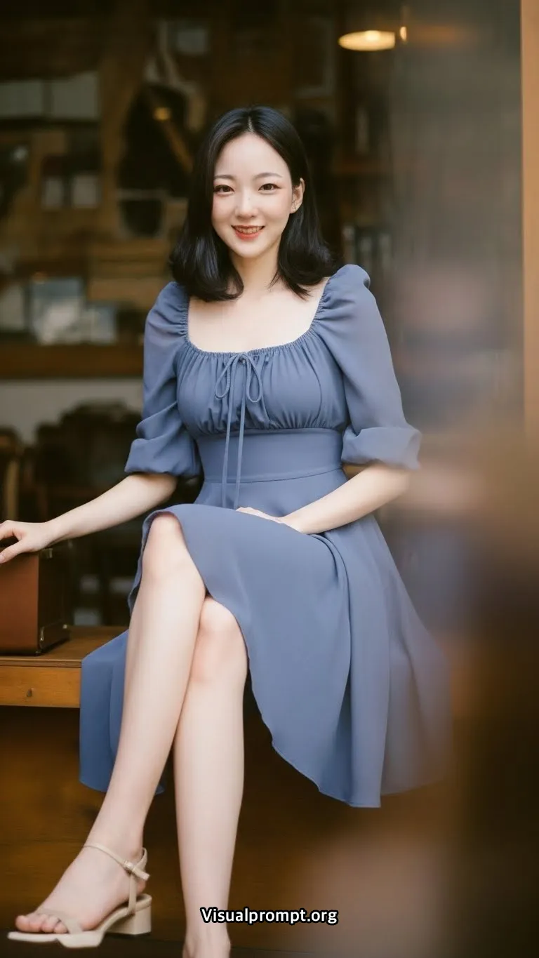 A tall woman with a fair complexion and shoulder-length black hair. She has a skinny frame with (perfectly contoured physique:1.5) significantly large breasts, (cleavage visible:5) and pretty legs, and pretty legs, featuring highly detailed skin texture and facial details. She is wearing a dusty blue, knee-length dress with a deep square neckline, and a tie detail at the bust. Her footwear is light-colored, open-toed shoes with low heels.
