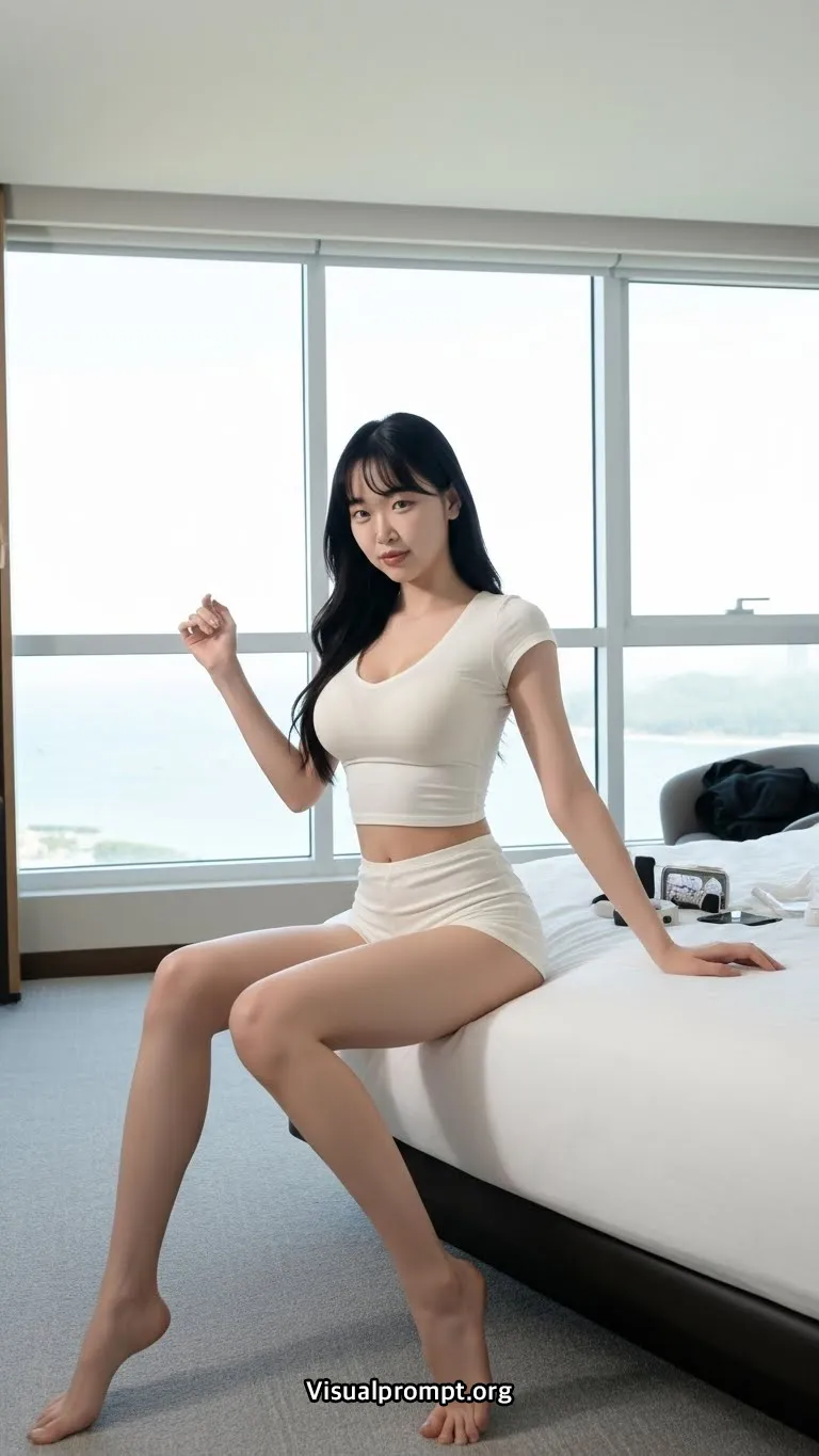 The bright, modern guest rooms feature large windows offering panoramic ocean or bay views. Her small personal belongings are neatly arranged on the bed. The rooms, bathed in bright, even natural light like studio lighting, create a comfortable, cozy, and intimate atmosphere
