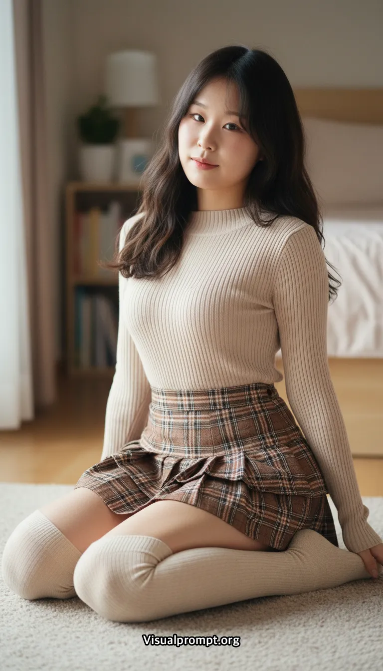 Wearing a cozy, light beige or tan long-sleeved ribbed tight knit sweater paired with a high-waisted, brown and reddish-brown plaid tiered pleated miniskirt. The outfit is completed with matching light beige knit knee-high socks
