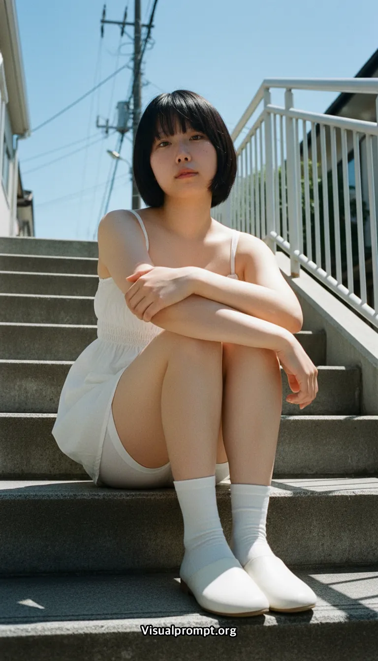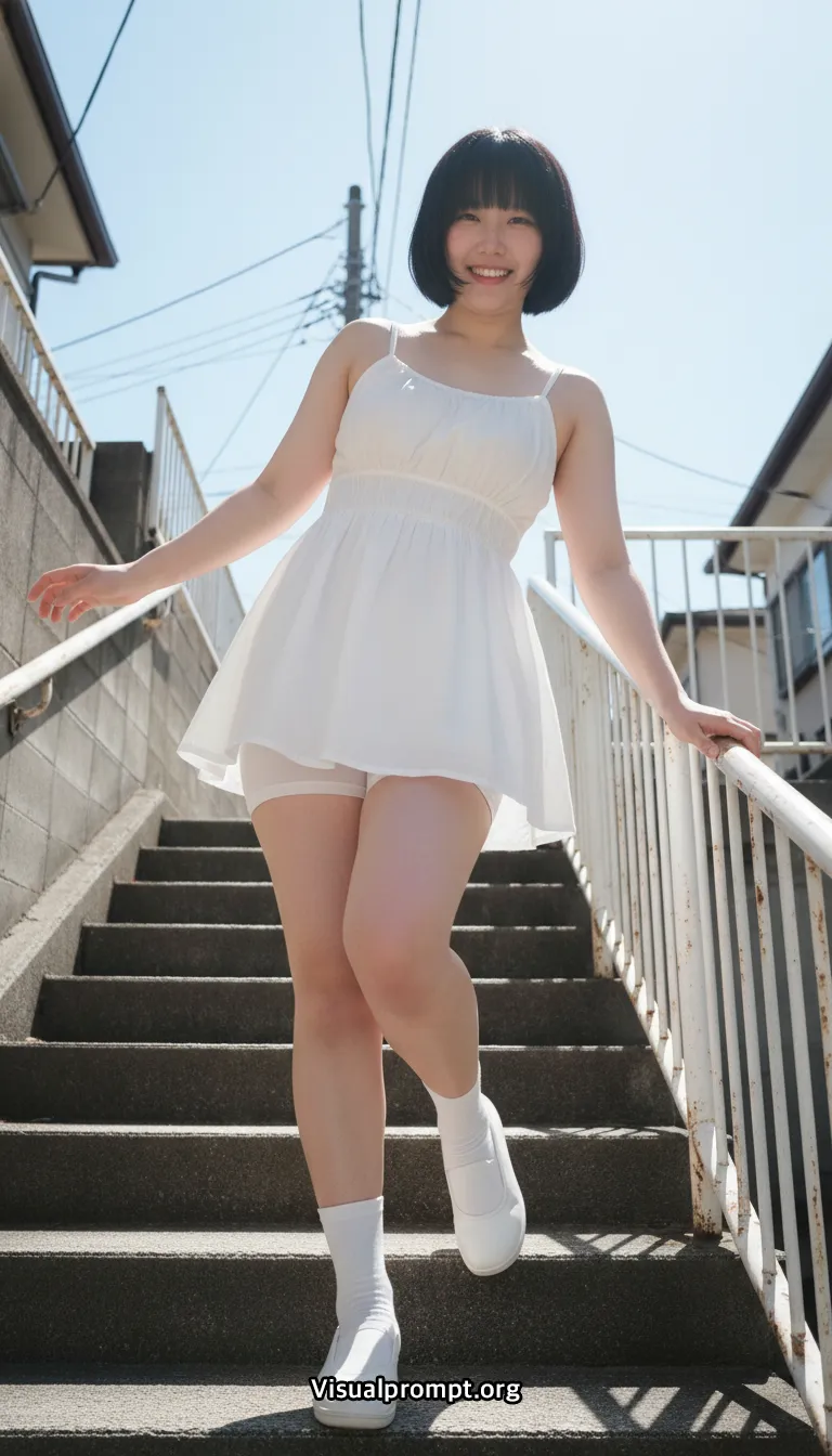 모델은 단정한 보브 컷과 담담한 표정으로 과장되지 않은 분위기를 유지하고, 얇은 코튼 소재의 화이트 슬리브리스 미니 드레스는 가볍게 움직이며 여름의 공기를 전달한다. 계단을 오르내리는 순간을 뒤에서 포착해 허리부터 힙으로 이어지는 자연스러운 곡선과 움직임이 강조되고, 콘크리트 계단과 난간, 파란 하늘과 전선이 어우러진 주거지 배경이 현실적인 거리 풍경을 완성한다.