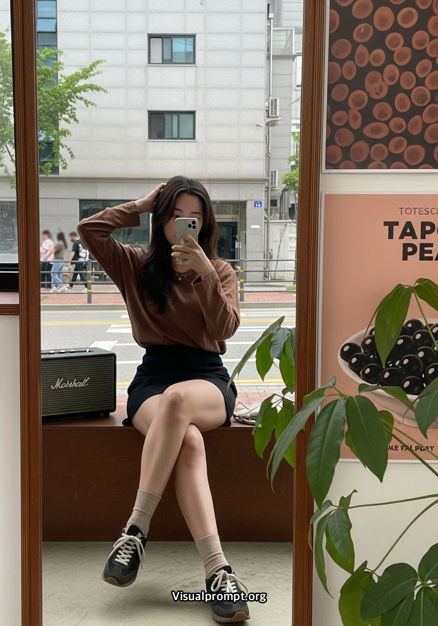 A young Asian woman, estimated to be in her 20s, is seen in the reflection.