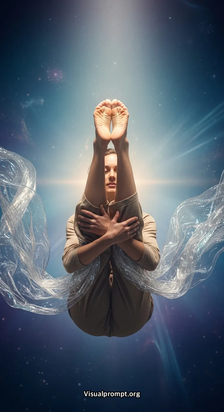 프롬프트with **both legs gracefully lifted, bent at the knees, and held in front of her body**. Her hands are **gently clasped beneath her calves**, supporting her legs with an elegant and balanced posture.태그🏷️ 체조선수, 포즈