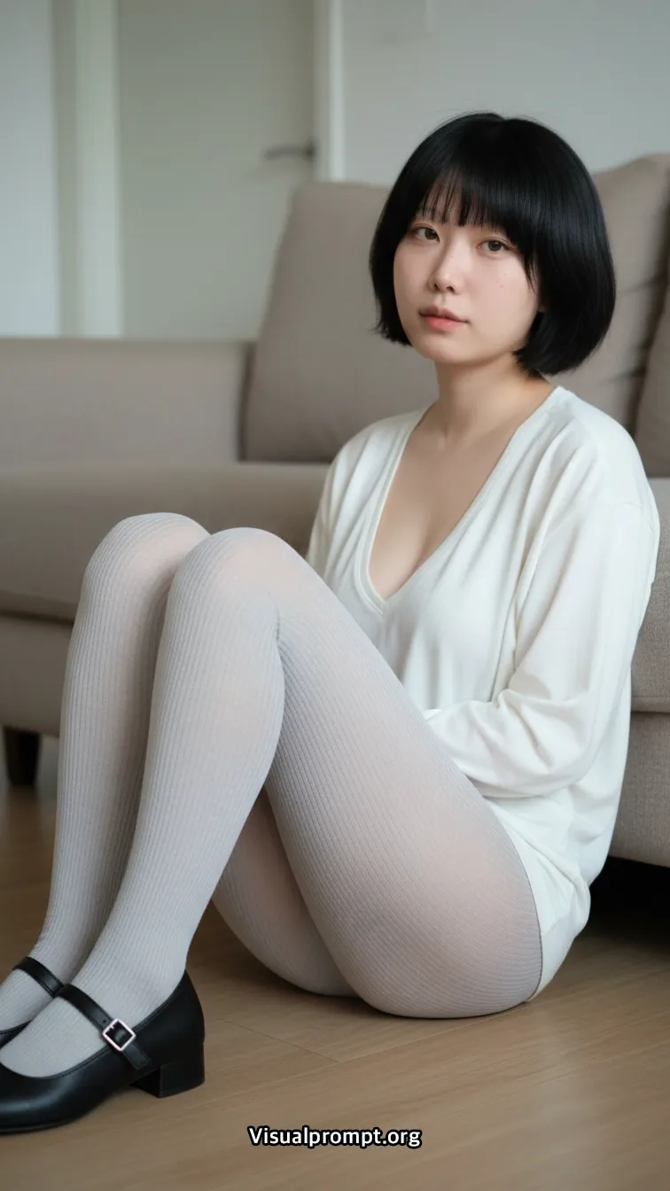 얇은 골지 타이즈의 질감과 클래식한 메리제인 슈즈 실루엣이 미니멀한 스타일을 완성하며, 움직임의 전후 순간을 담아낸 카메라 연출로 편안하면서도 세련된 분위기를 강조한다. 전체적으로 과하지 않은 디테일과 균형 잡힌 구도가 일상의 여유와 우아함을 전달한다.