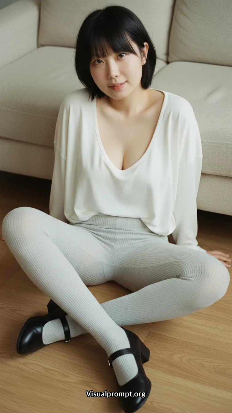 the overall look is minimal, casual, and understated, with emphasis on the texture and fit of the ribbed tights and the classic silhouette of the shoes.