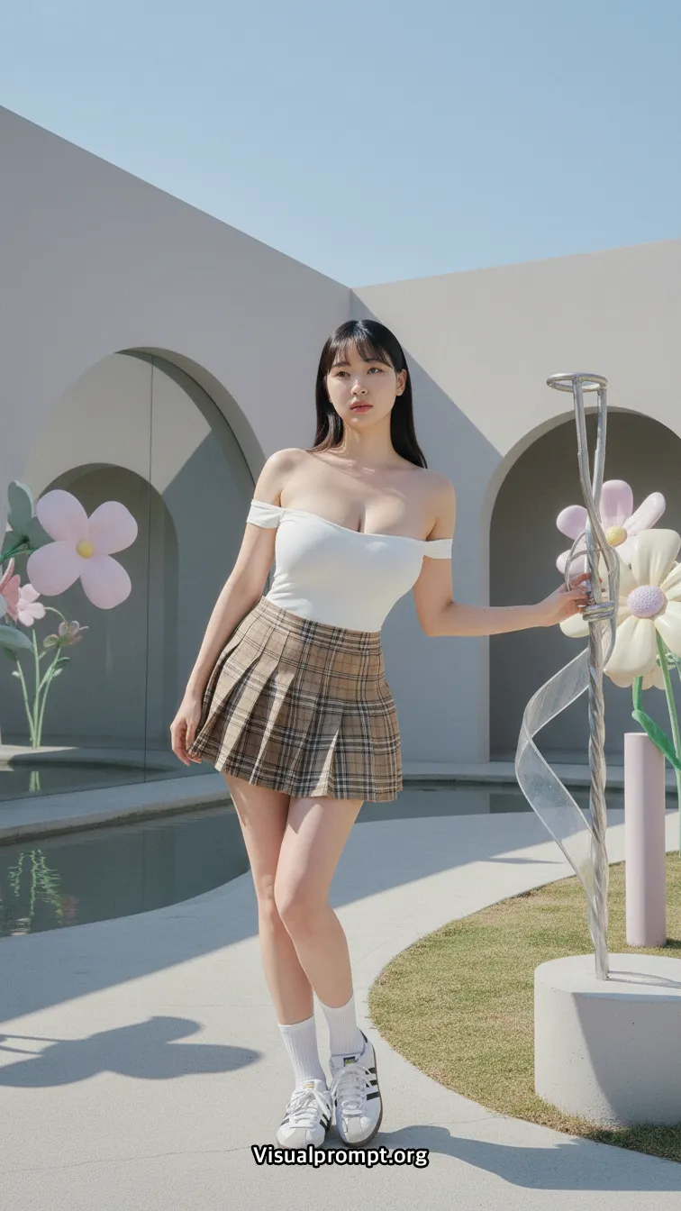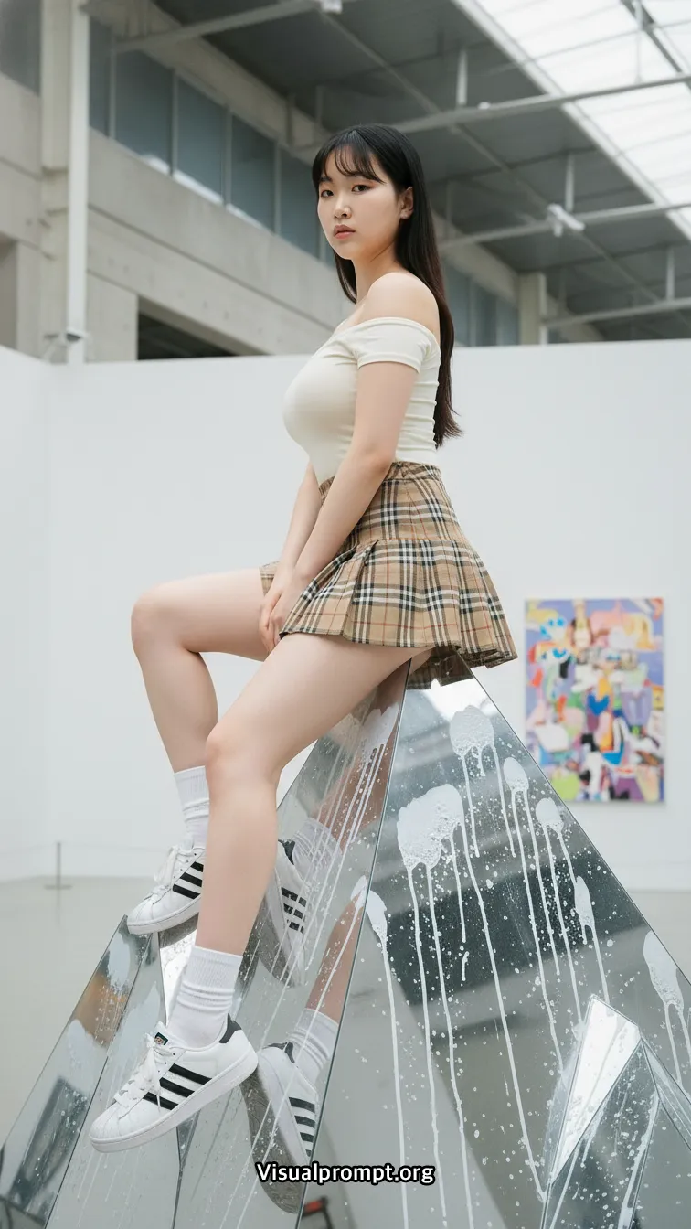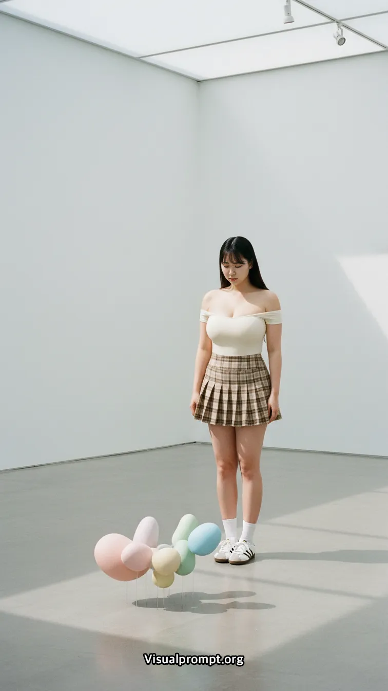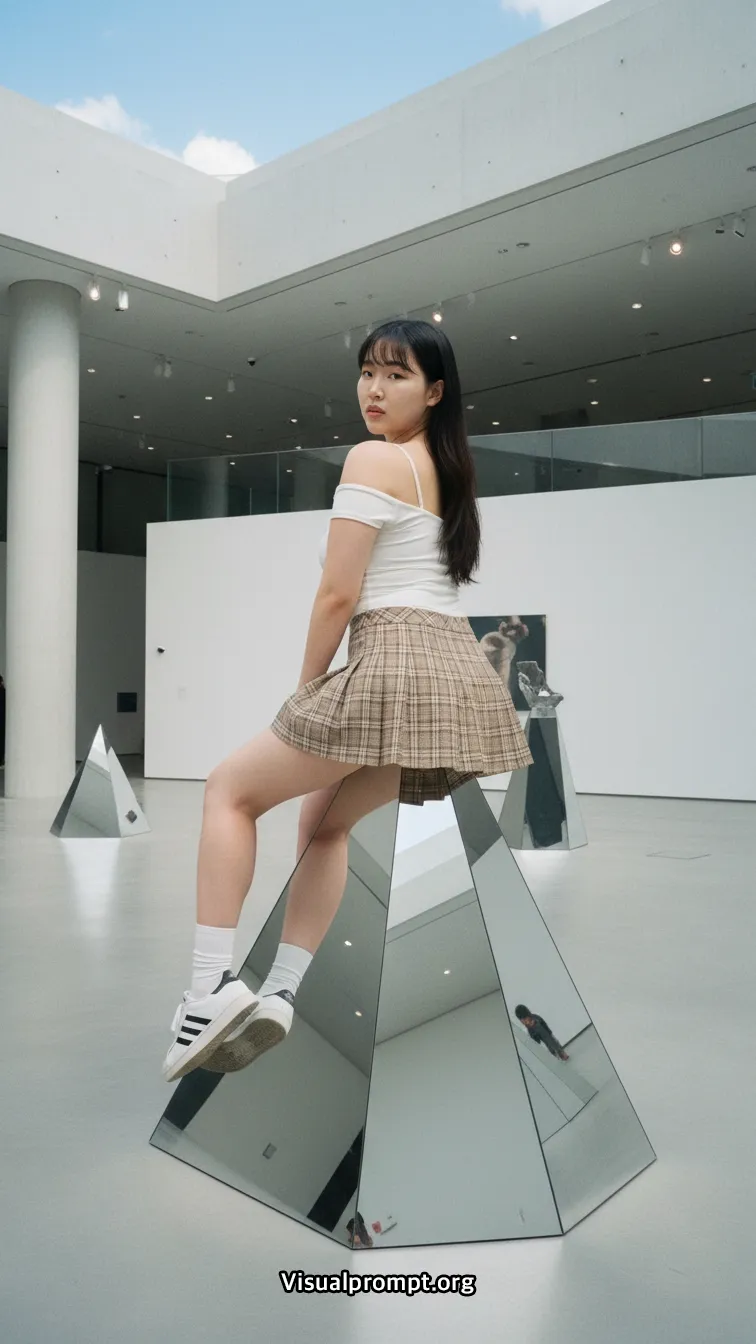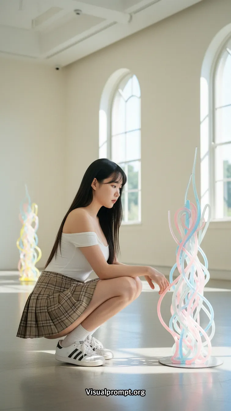 현대 미술의 실험적인 조형물과 패션이 만나면 단순한 사진 이상의 예술적 가치를 전달합니다.