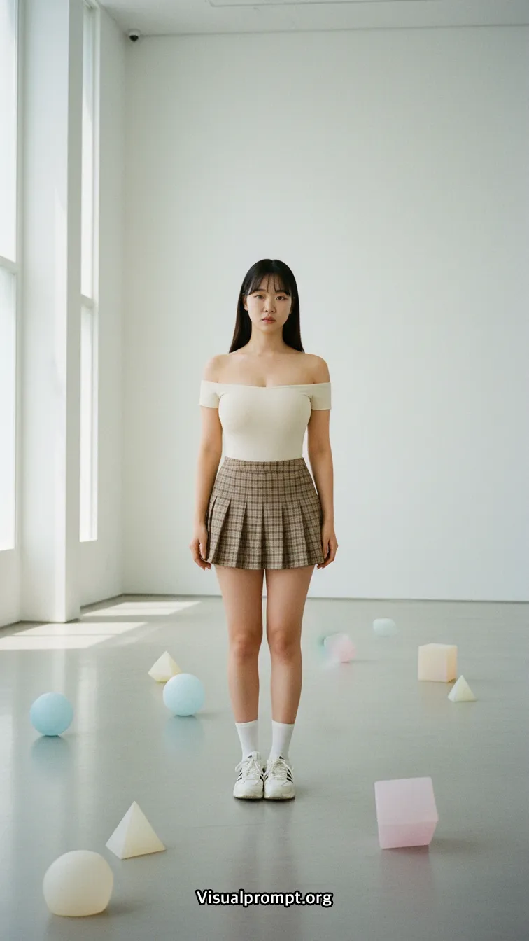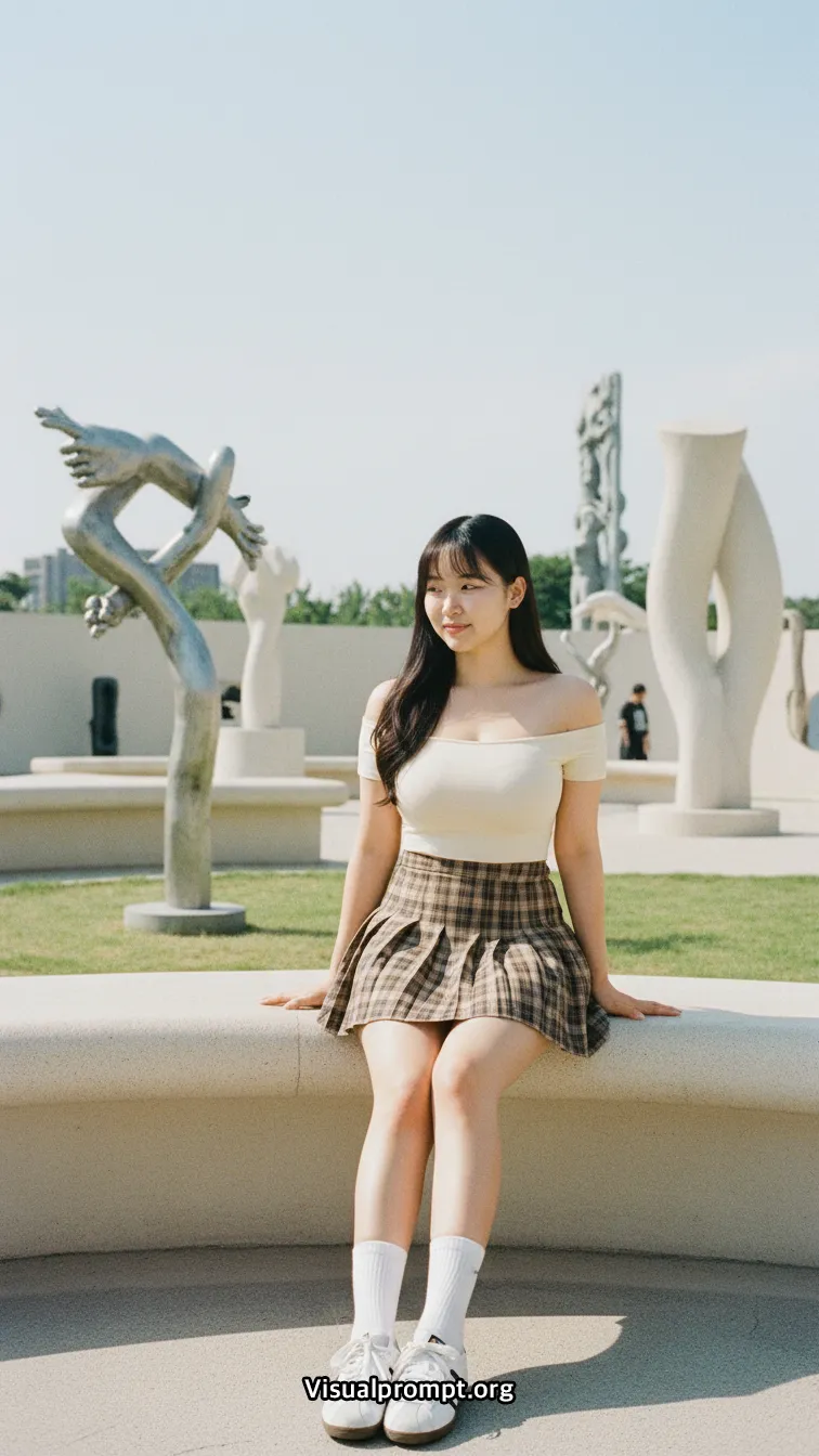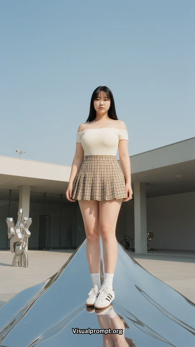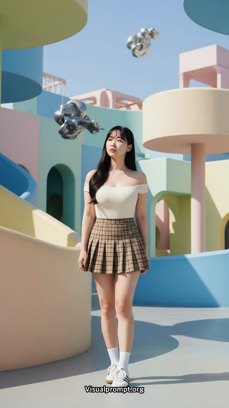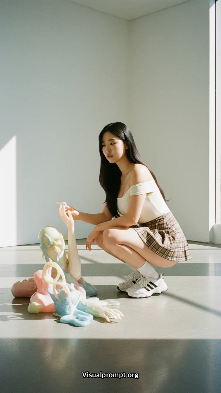 현대 미술의 실험적인 조형물과 패션이 만나면 단순한 사진 이상의 예술적 가치를 전달합니다.
