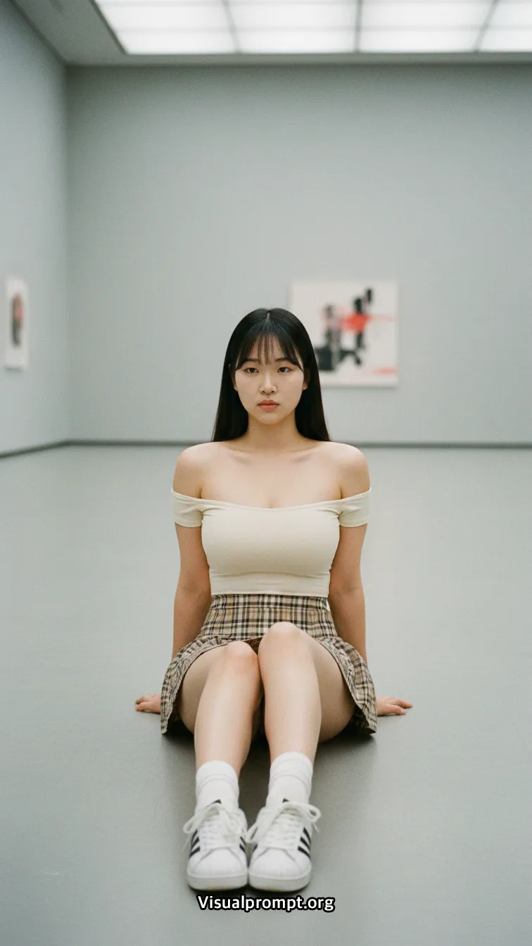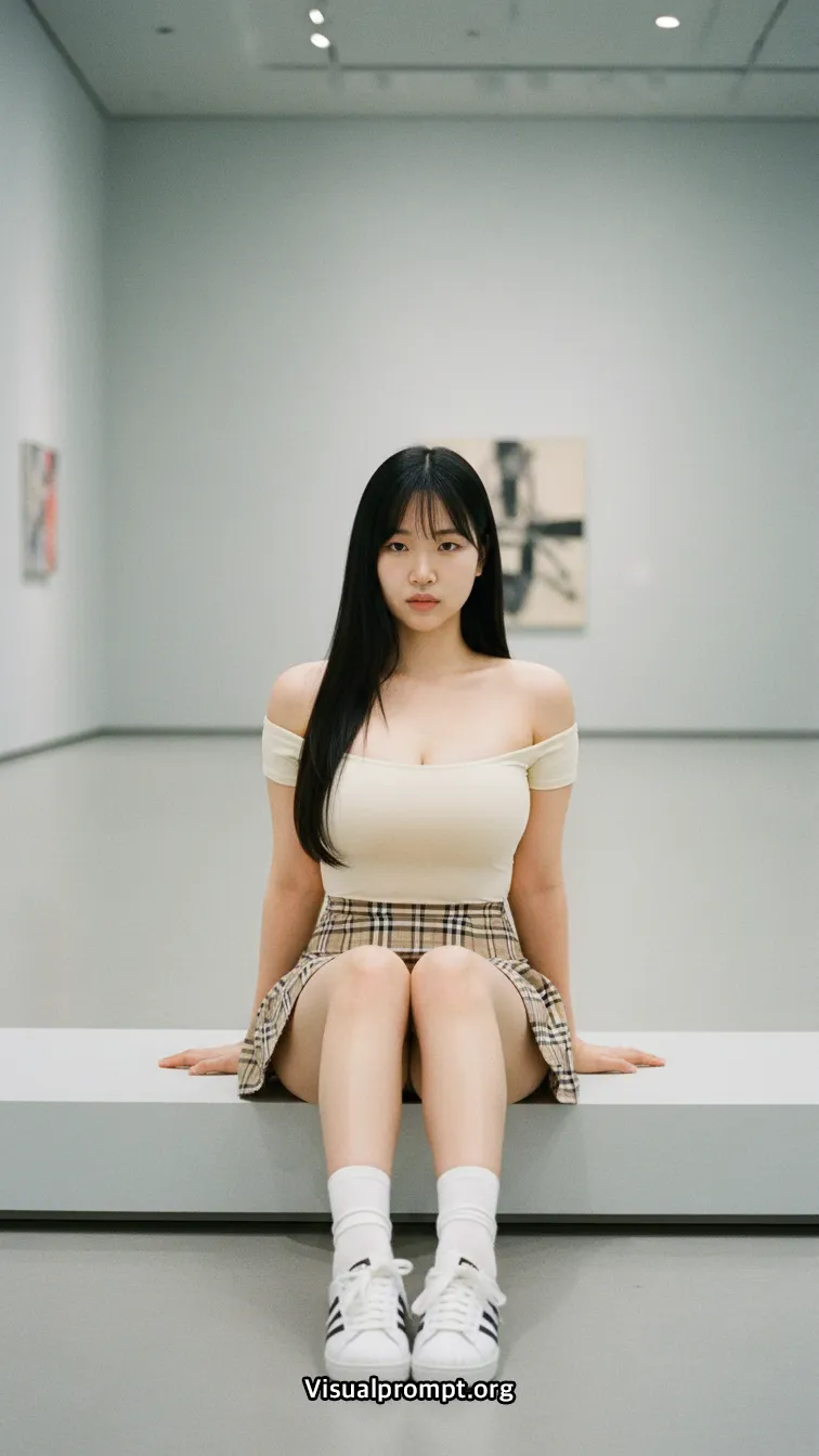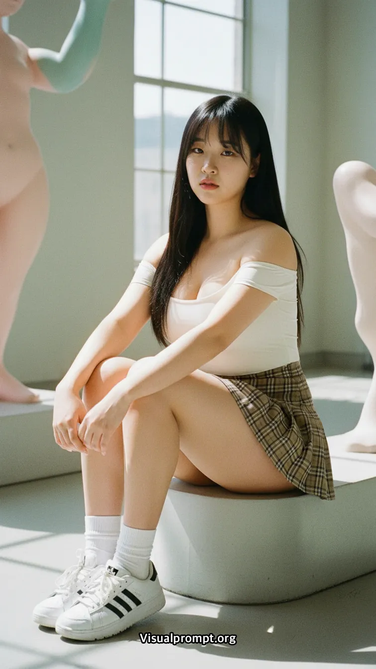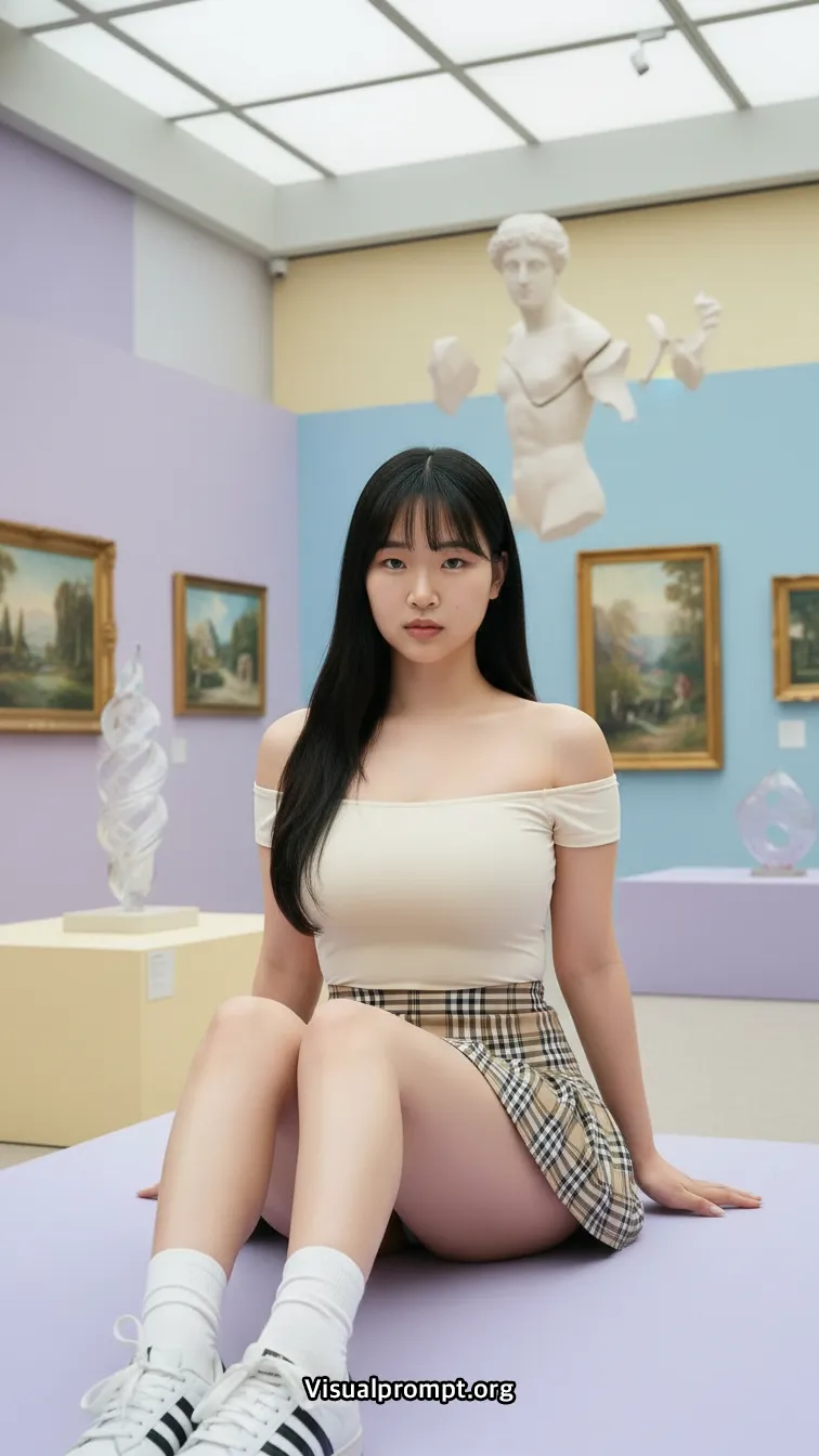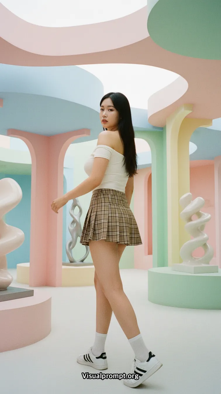 현대 미술의 실험적인 조형물과 패션이 만나면 단순한 사진 이상의 예술적 가치를 전달합니다.