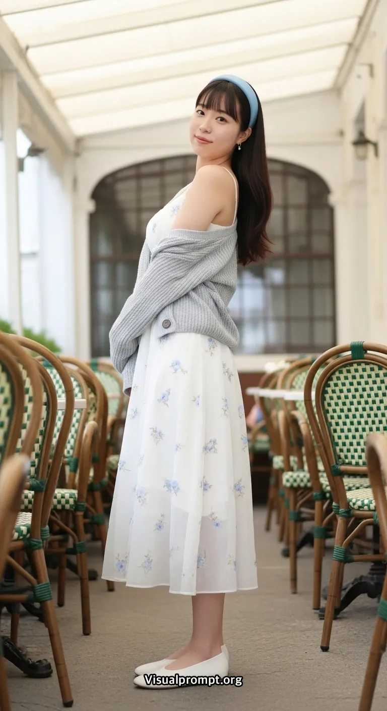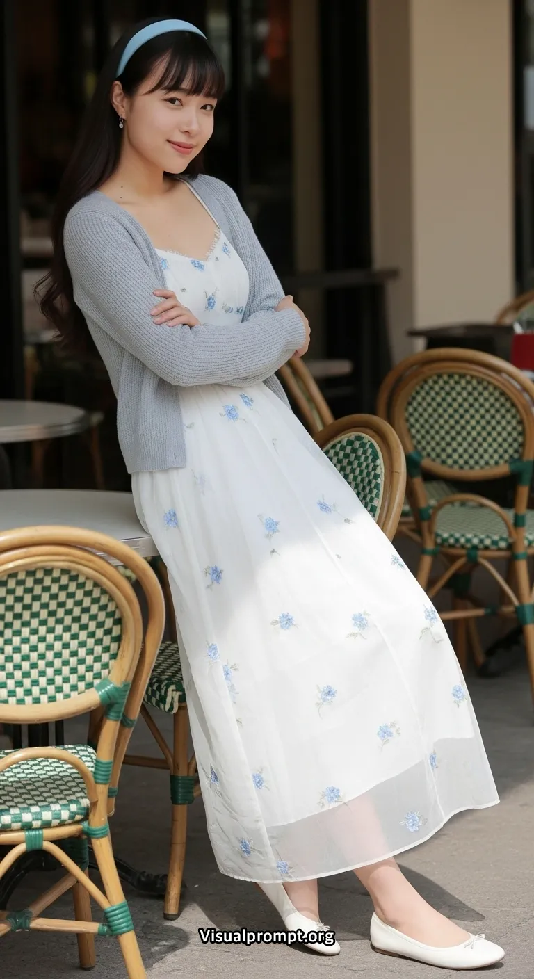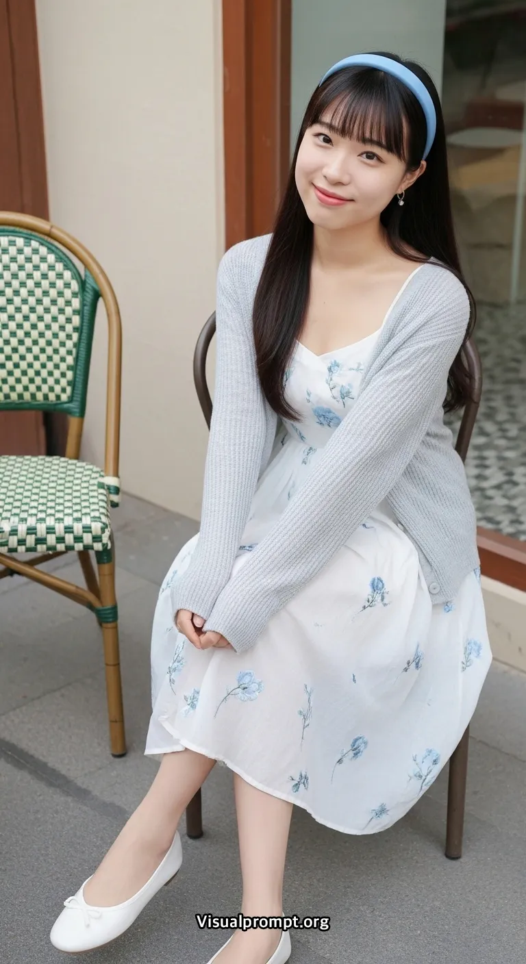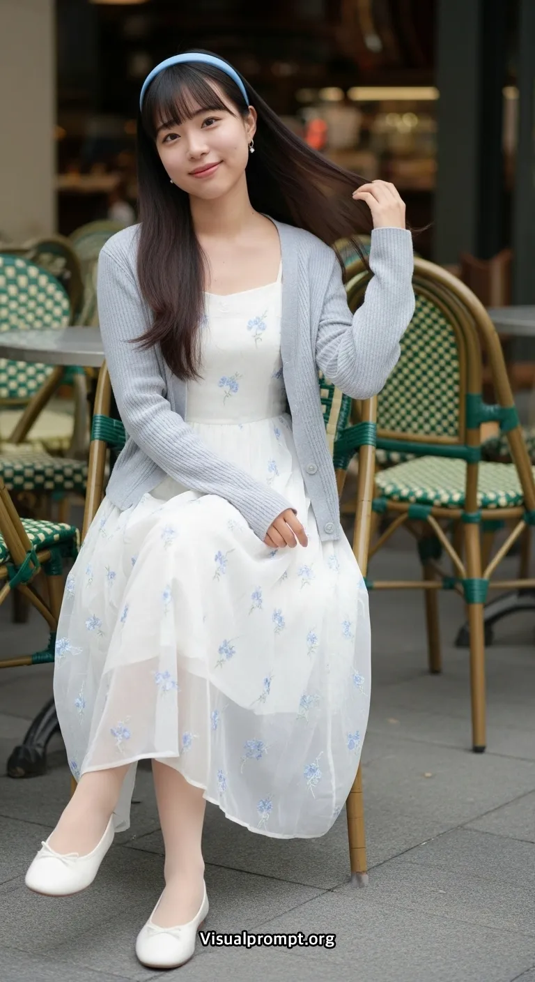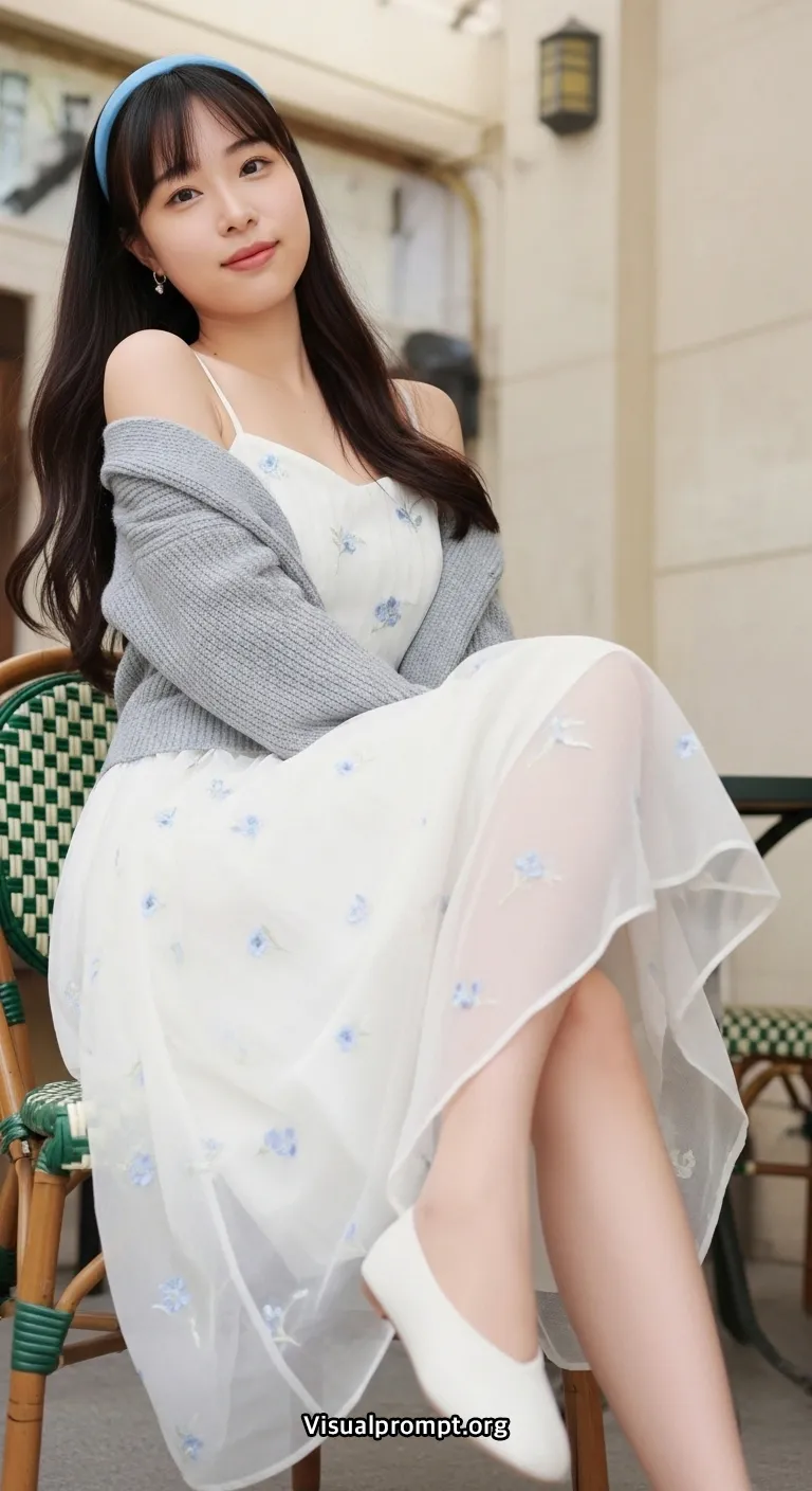 Korean woman in her early 20s with a slender figure and fair skin, her long dark brown hair flowing down her shoulders as she holds a faint smile and strikes a sensual pose with her fingertips gently covering her lips or touching her chin. She is wearing a light blue headband, a flowing white ankle-length sundress delicately embroidered with small, light blue flowers, a light gray knit cardigan partially buttoned over the dress, and white ballet flats, set against the background of a small cafe or patio area with rattan-style chairs that have woven green and white patterns.