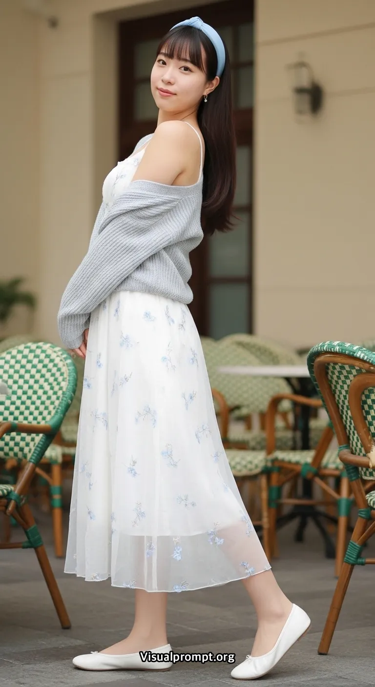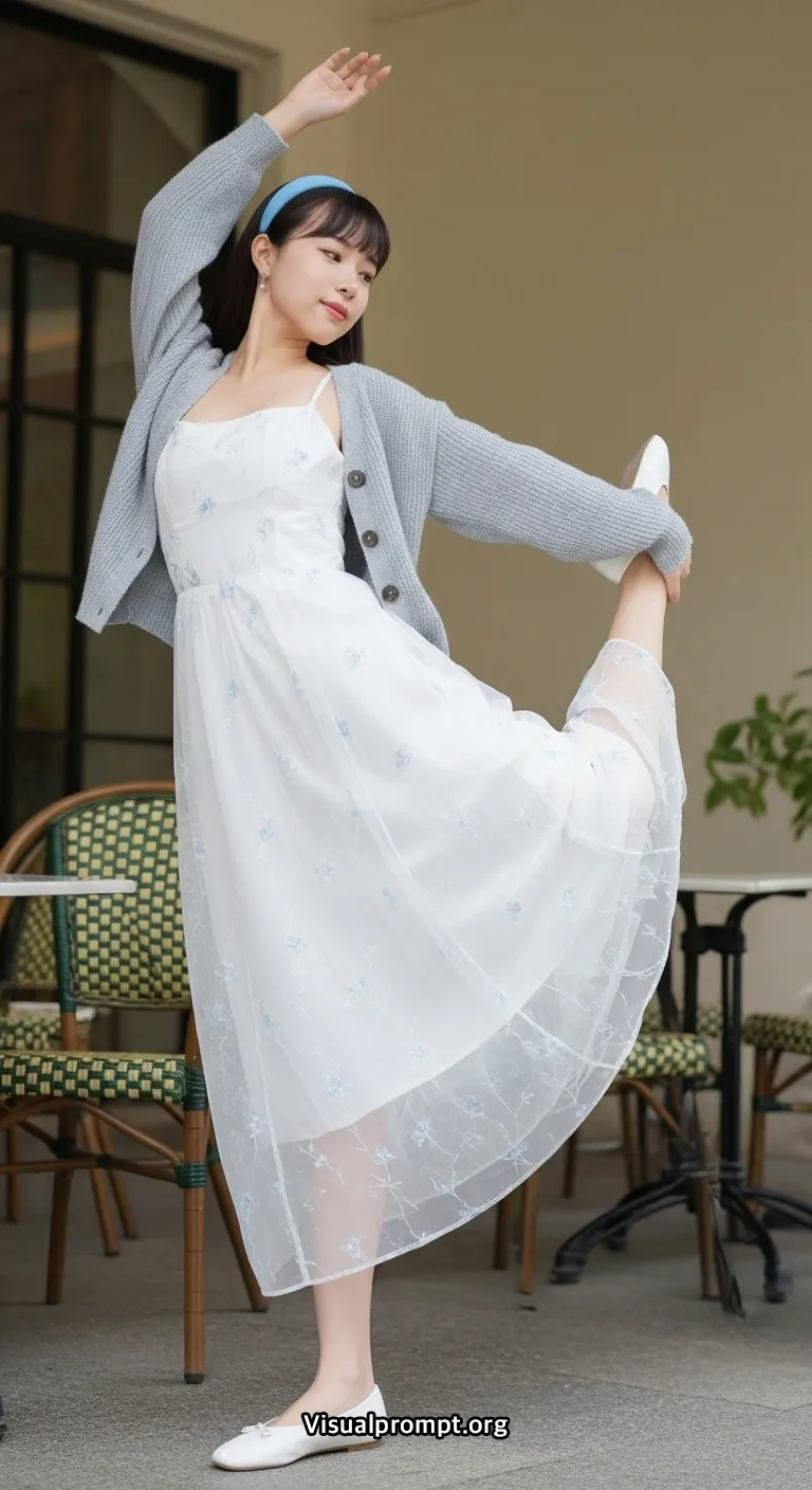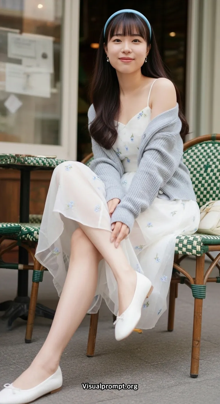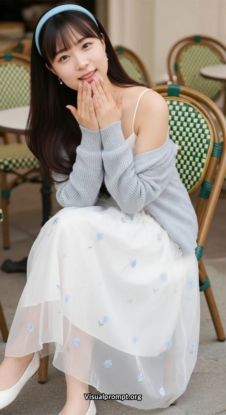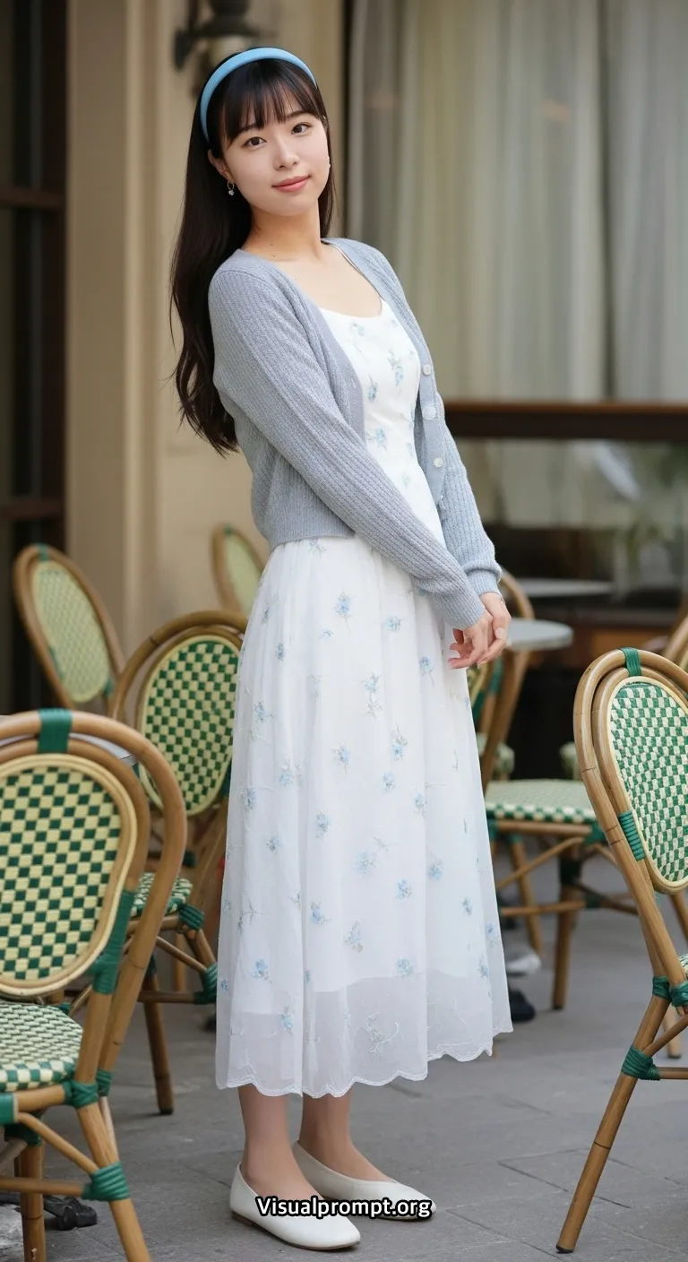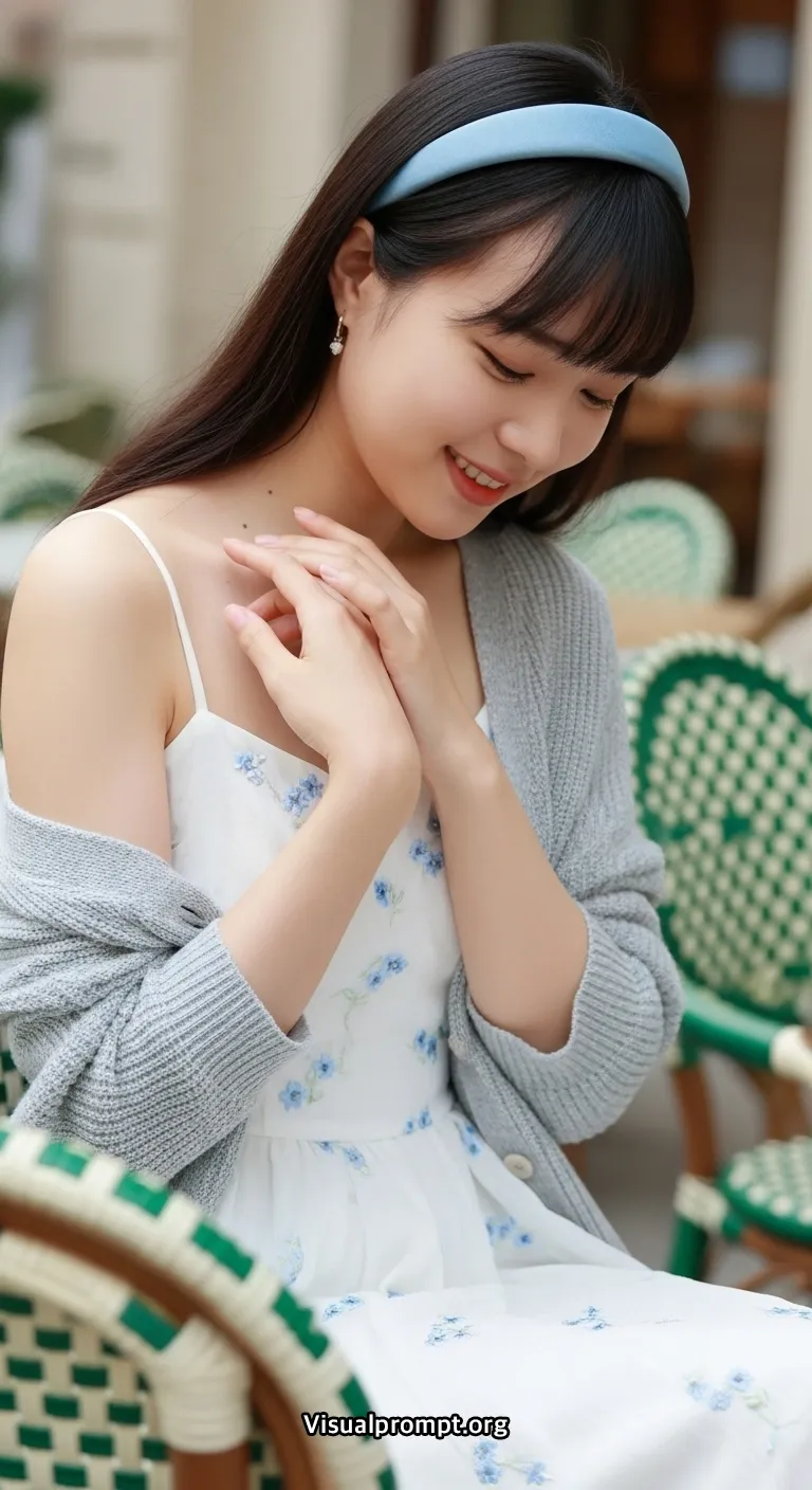 Korean woman in her early 20s with a slender figure and fair skin, her long dark brown hair flowing down her shoulders as she holds a faint smile and strikes a sensual pose with her fingertips gently covering her lips or touching her chin. She is wearing a light blue headband, a flowing white ankle-length sundress delicately embroidered with small, light blue flowers, a light gray knit cardigan partially buttoned over the dress, and white ballet flats, set against the background of a small cafe or patio area with rattan-style chairs that have woven green and white patterns.