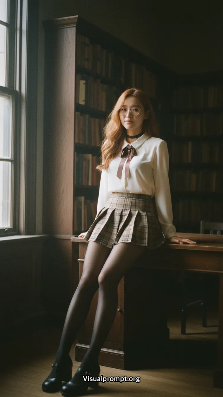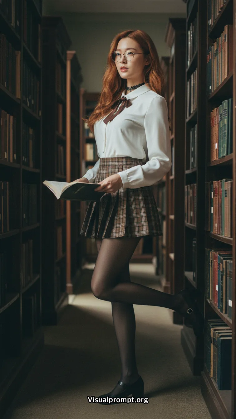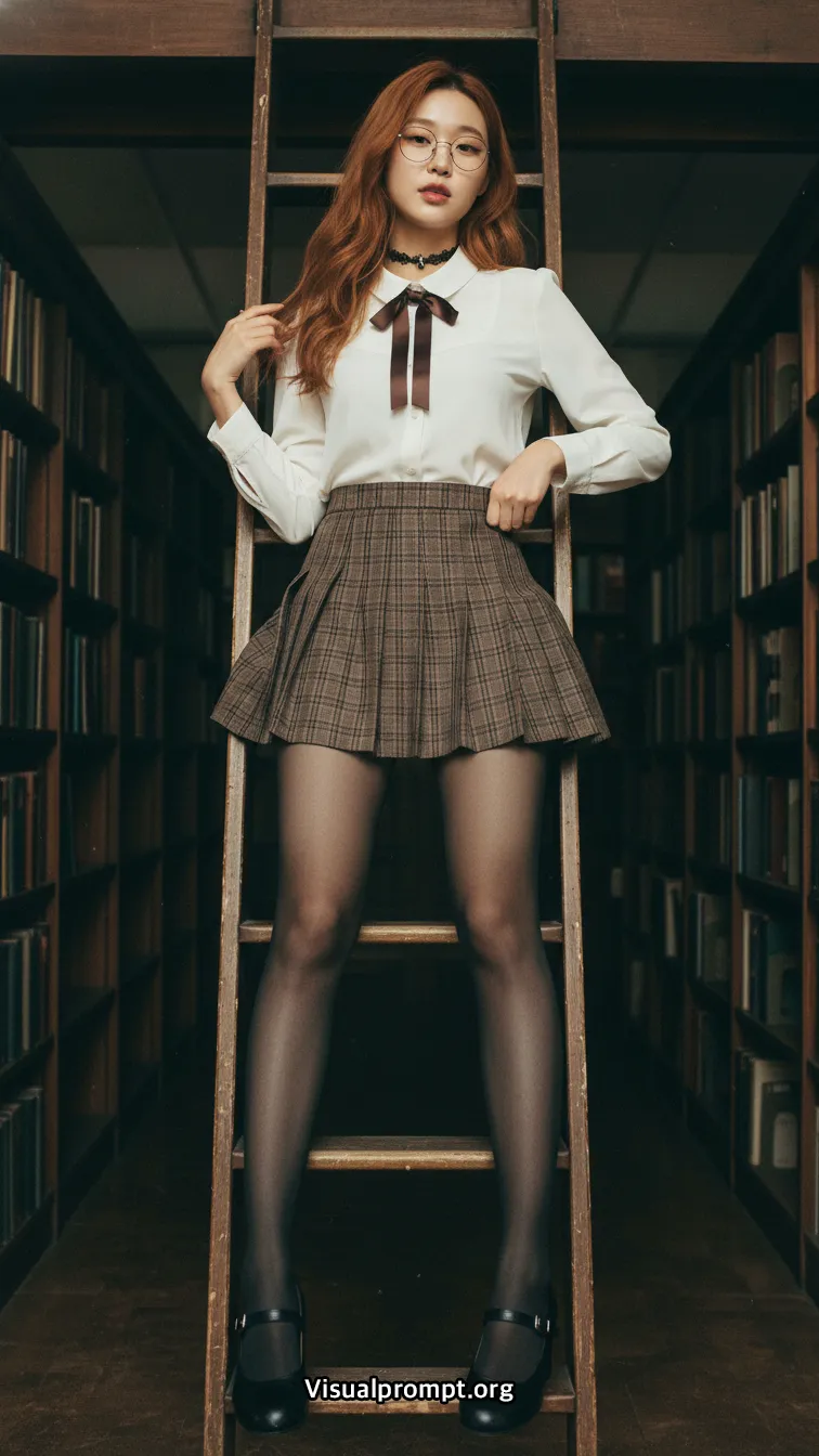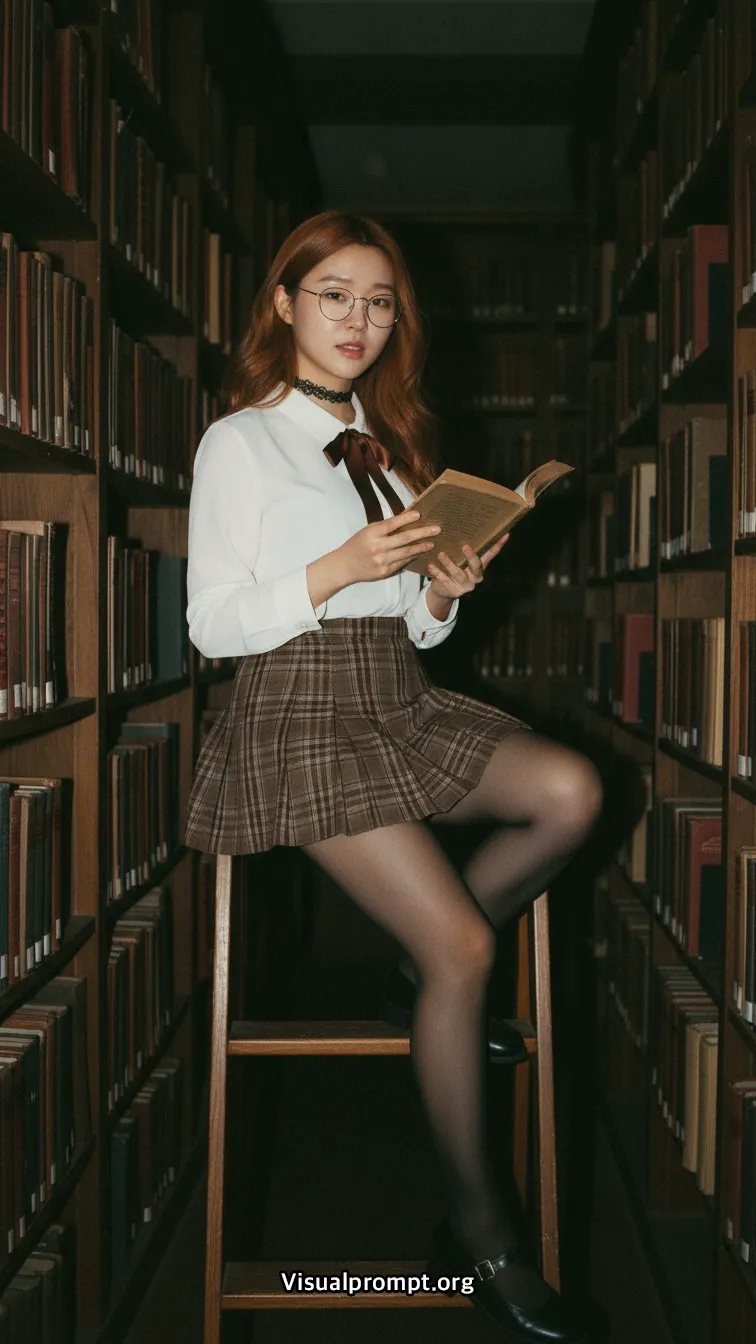 차분한 도서관 공간을 배경으로, 클래식한 의상 질감과 구조가 강조된 스타일링이 돋보인다.