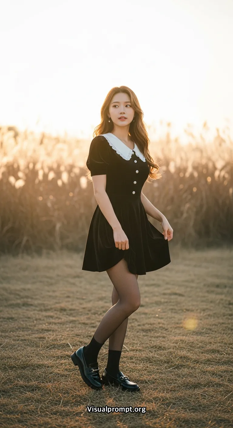 A full-body portrait of a young Korean woman standing in an open field at golden hour. The woman, who appears to be in her late teens or early twenties, has fair skin and long, wavy brown hair.